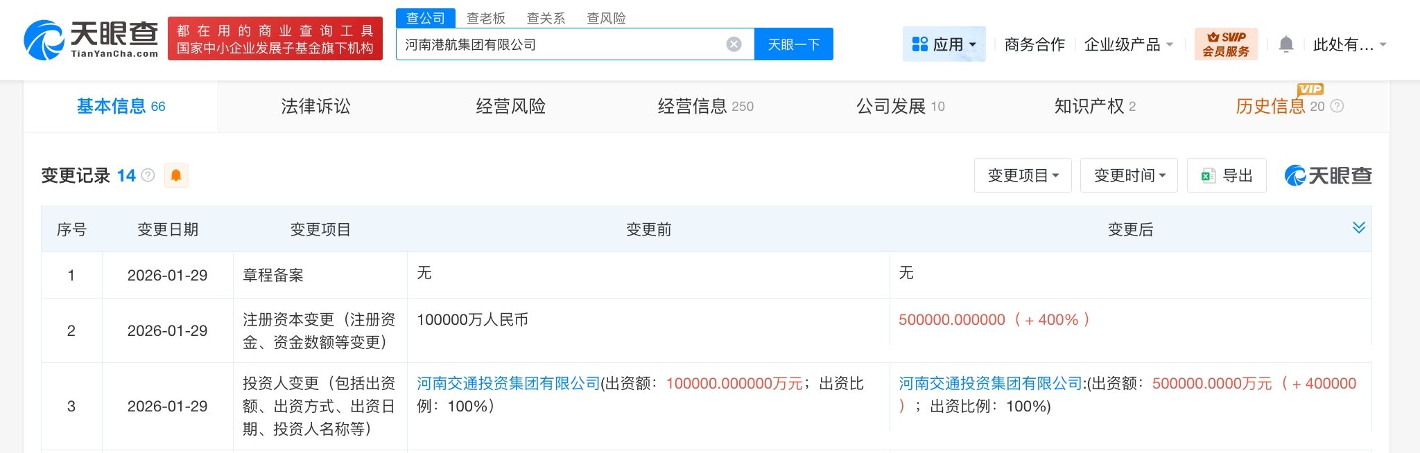 天眼查App显示,近日,河南港航集团有限公司发生工商变更,注册资本由10亿人民币增至50亿人民币,增幅400%。