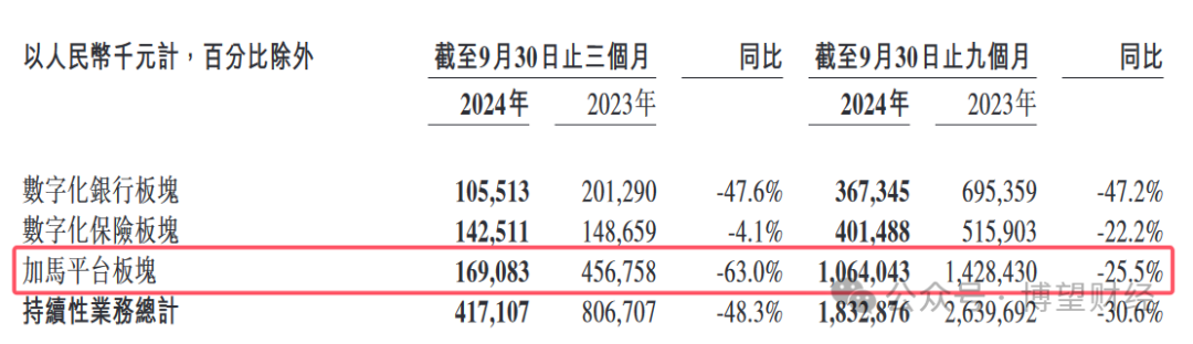 三季报数据来了。公司持续经营业务收入出现下滑。其中第三季度来自平安集团及陆金所的收入同比降幅达到了66.4%,营收占比降至50%以下。从财务数据看,加马平台及其云服务是金融壹账通最主要的收入板块。