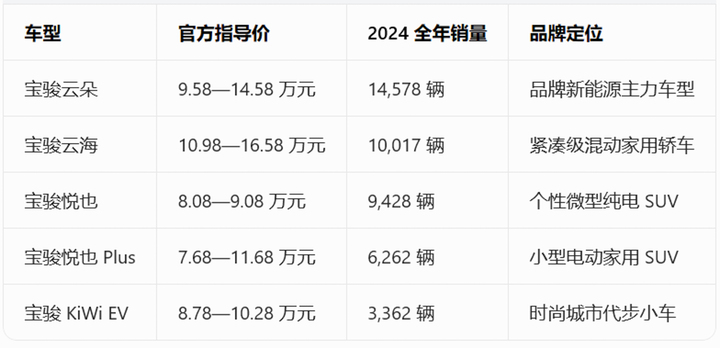 新能源车型中,即便表现最好的宝骏云朵,2024 年全年也仅14,578 辆,月均不过千余台;