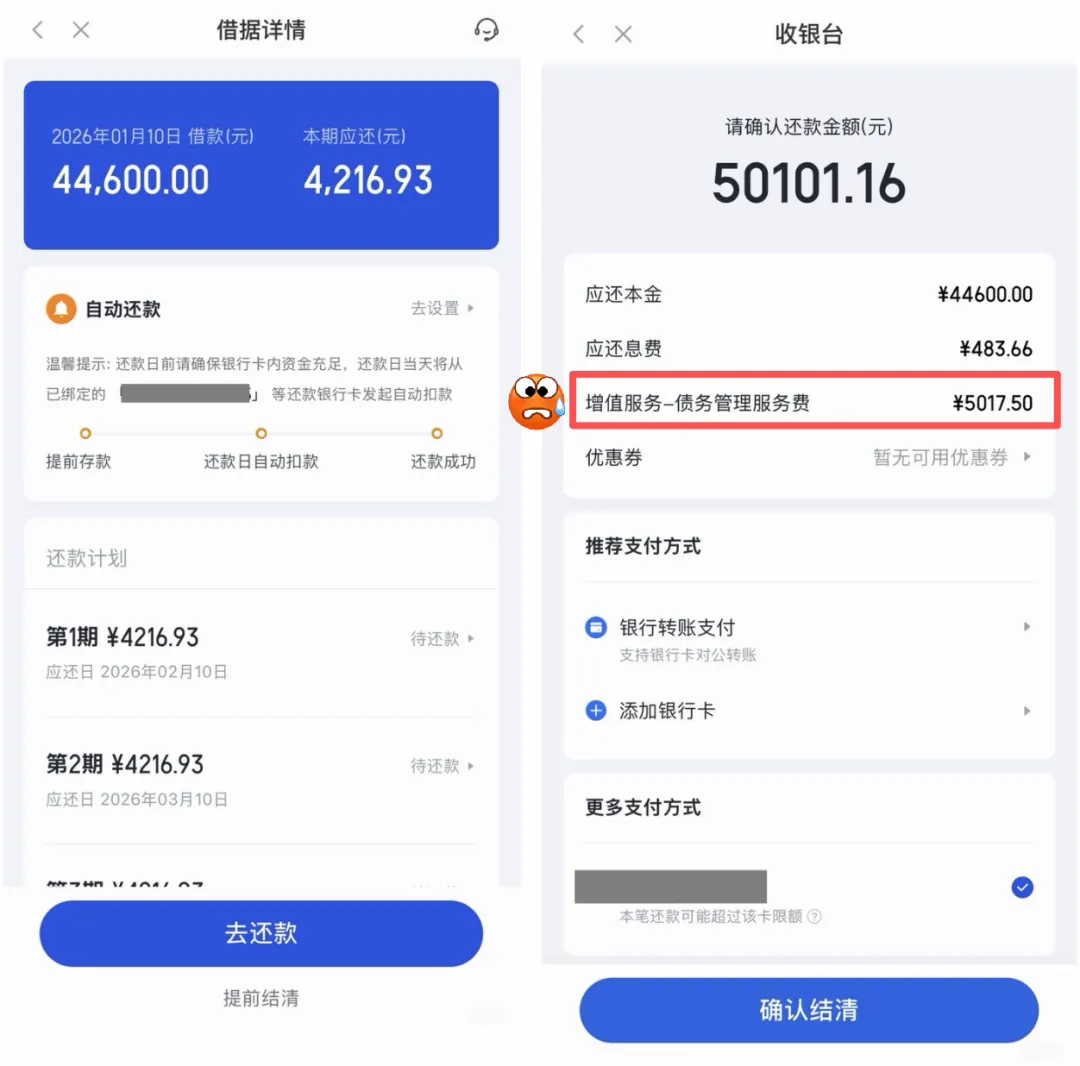 第一期和第二期,客户还需额外再支付5017.50元的「增值服务-债务管理服务费」。