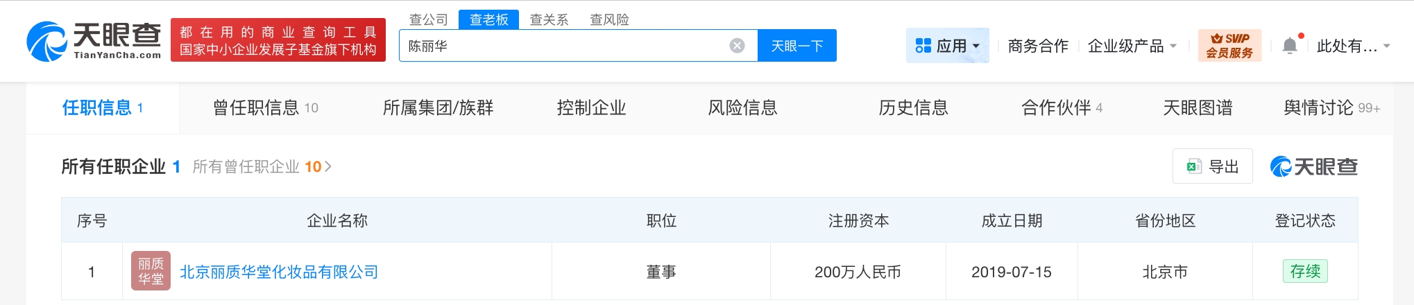 天眼查App显示,陈丽华名下关联1家公司,为北京丽质华堂化妆品有限公司,该公司成立于2019年7月,法定代表人为赵莉,注册资本200万人民币,经营范围含批发、零售化妆品、文具用品、电子产品等,由香港丽质华堂生物医药科技有限公司全资持股,陈丽华在该公司担任董事。值得一提的是,陈丽华此前曾在多家公司担任高管,包括北京富华金宝中心有限公司、北京长安俱乐部有限公司、北京丽苑公寓有限公司等。