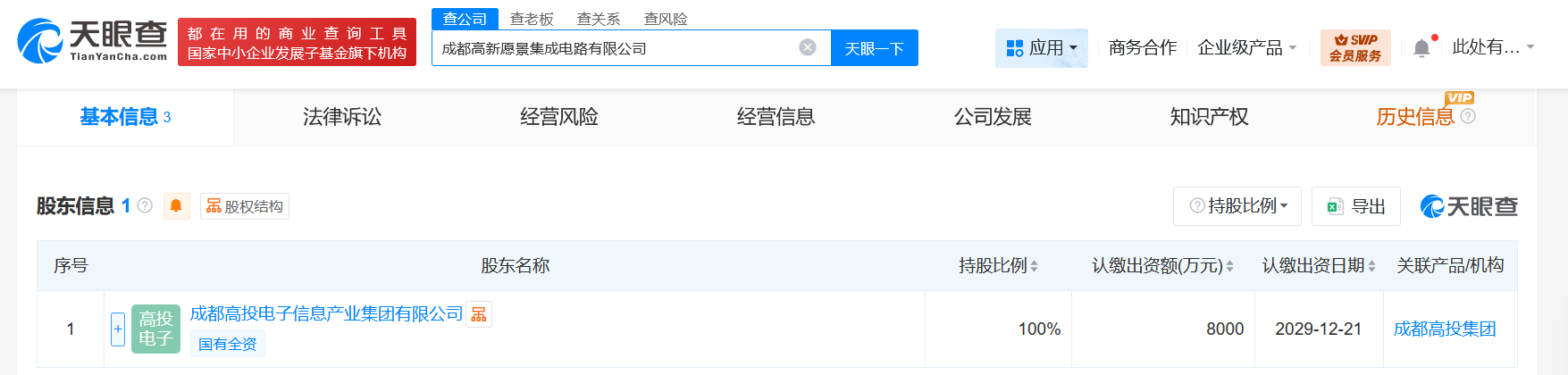 天眼查工商信息显示,近日,成都高新愿景集成电路有限公司成立,法定代表人为武文琦,注册资本8000万人民币,经营范围含集成电路制造、集成电路设计、软件开发、信息系统集成服务、半导体器件专用设备销售、集成电路芯片设计及服务、机械设备租赁、电力电子元器件销售等。股东信息显示,该公司由成都高投电子信息产业集团有限公司全资持股。
