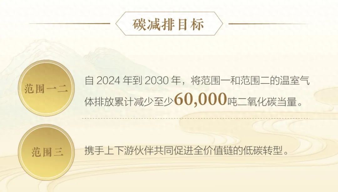 水井坊计划自2024年至2030年,累计减少范围一(直接排放)和范围二(间接排放)温室气体至少6万吨二氧化碳当量。同时,水井坊还通过深化与上下游伙伴合作,推动范围三(价值链相关排放)的全面低碳转型。