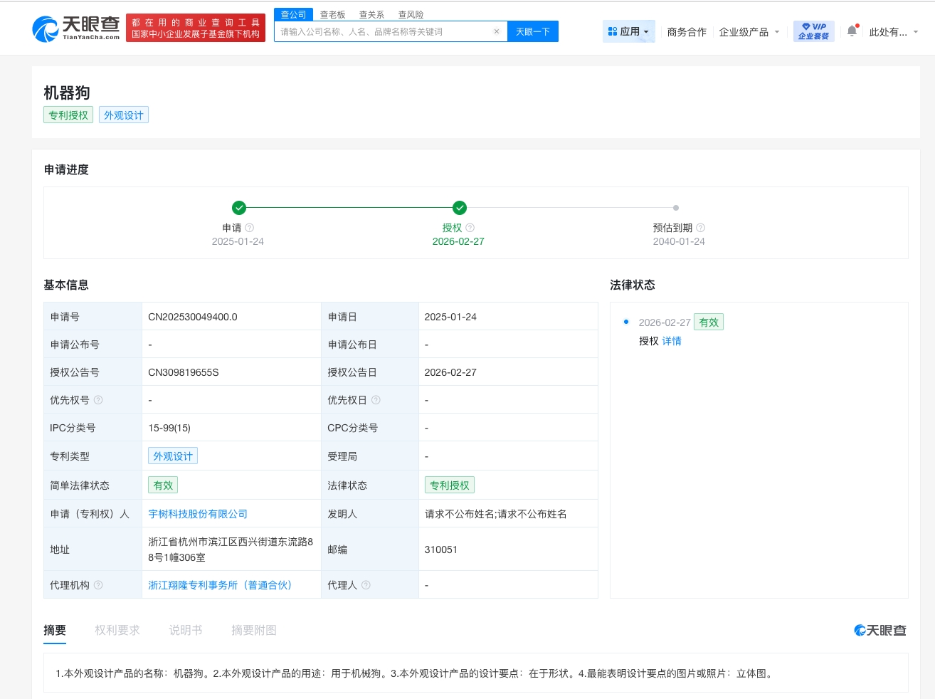 天眼查知识产权信息显示,近日,宇树科技股份有限公司申请的“机器狗”外观专利获授权。摘要显示,本外观设计产品的用途为机械狗,本外观设计产品的设计要点在于形状。