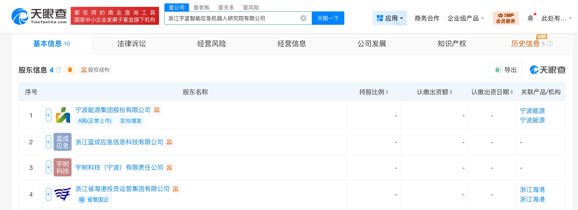 天眼查工商信息显示,近日,浙江宇蓝智能应急机器人研究院有限公司成立,法定代表人为李晓峰,注册资本1000万人民币,经营范围包括技术服务、技术开发、技术咨询、技术交流、技术转让、技术推广,智能机器人的研发,人工智能基础软件开发等。股东信息显示,该公司由宁波能源(600982)、浙江蓝成应急信息科技有限公司、宇树科技(宁波)有限责任公司、浙江省海港投资运营集团有限公司共同持股。