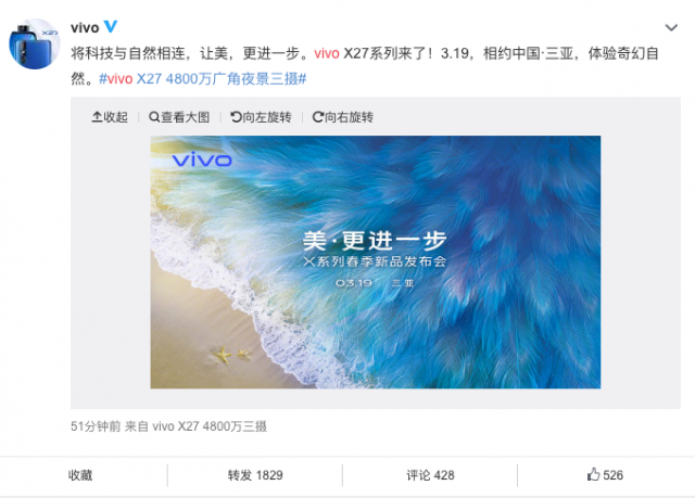 【TechWeb】今天vivo官方正式官宣,表示将在3月19日于三亚正式召开新品发布会,届时将会带来全新vivo X27新机。同时官方也透露了新机将会搭载4800万像素广角夜景三摄,非常值得期待。