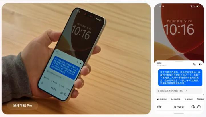 在演示视频里,用户只需开口下令,手机便能自动调用不同APP,完成比价、订餐、规划行程等一连串复杂操作,与当初IPhone16提到的AI手机概念有异曲同工之妙,甚至更强大。