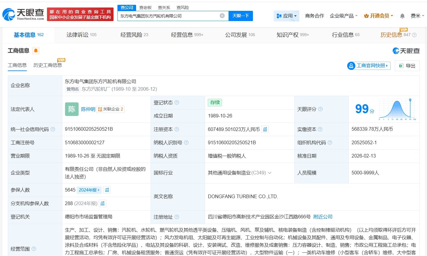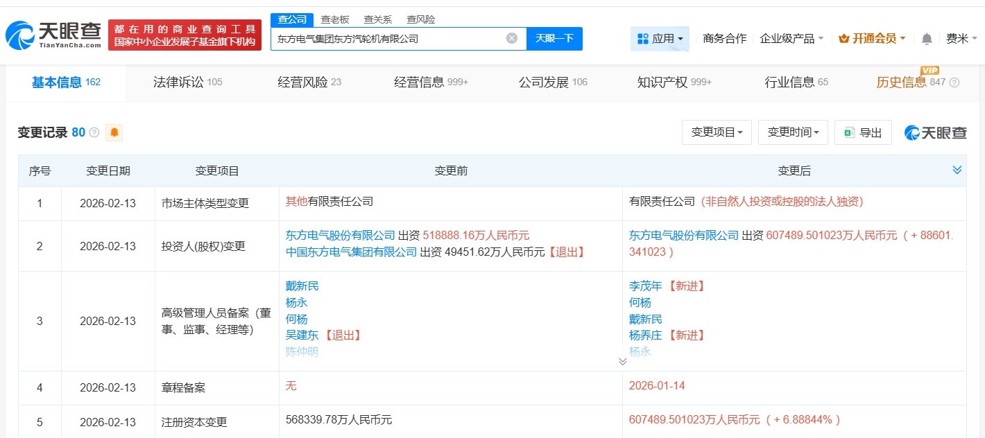 天眼查App显示,近日,东方电气集团东方汽轮机有限公司发生工商变更,原股东中国东方电气集团有限公司退出,同时,注册资本由约56.8亿人民币增至约60.7亿人民币,增幅约7%。