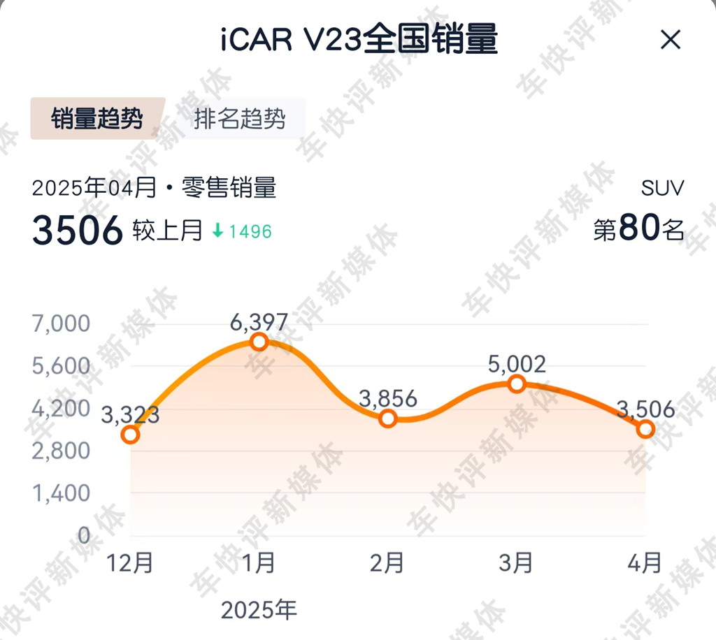 那下面再来看一下iCAR旗下两款车型的销量数据,5月的目前官方还没有公布,从前4个月的销量表现来看,新上市的iCAR V23整体的销量是要高于iCAR 03的。比如在4月,iCAR V23销量为3506辆,iCAR 03销量2185辆。