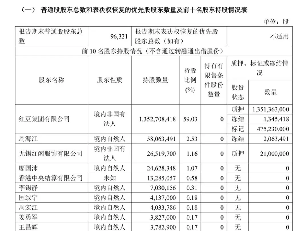除此之外,控股股东深陷诉讼纠纷也影响着红豆集团的管理得分。公司控股股东红豆集团有限公司(以下简称“红豆集团”)持有公司股份1,352,708,418股,占公司总股本的59.03%;红豆集团及其一致行动人周海江、无锡红闳服饰有限公司合计持有公司股份1,437,291,609股,占公司总股本的62.72%。