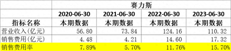 与营收下滑不同,今年上半年,赛力斯销售费用由14.6亿元提升至17.32亿元,同比增幅接近20%,销售费用率也由此大幅提高。