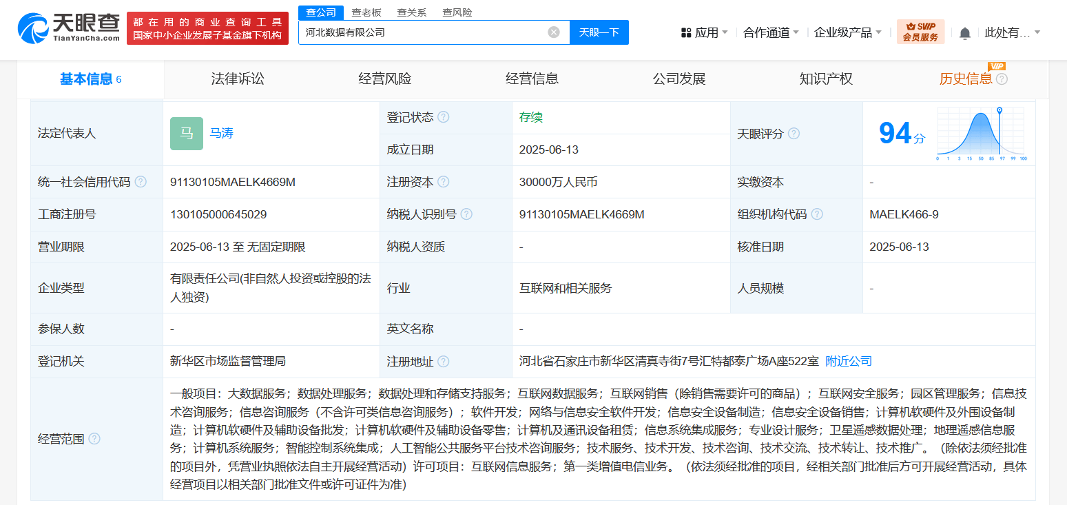 天眼查App显示,近日,河北数据有限公司成立,法定代表人为马涛,注册资本3亿人民币,经营范围含大数据服务、数据处理服务、数据处理和存储支持服务、互联网数据服务、信息技术咨询服务、信息咨询服务、网络与信息安全软件开发、信息安全设备制造、人工智能公共服务平台技术咨询服务等,由河北建设投资集团有限责任公司全资持股。