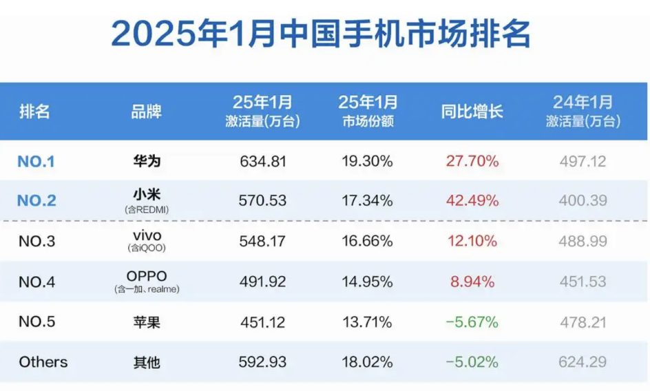 如刘飞和张洋所言,2024年全年荣耀出货量约4220万台,同比下滑3%,低于行业4%的增速。2025年1月,荣耀激活量未能闯进TOP5,和魅族、中兴等品牌同时成为“Others”的存在。2025年Q1,按照苹果该季度果出货量同比下滑9%至980万台来看,当前荣耀的出货量不容乐观。