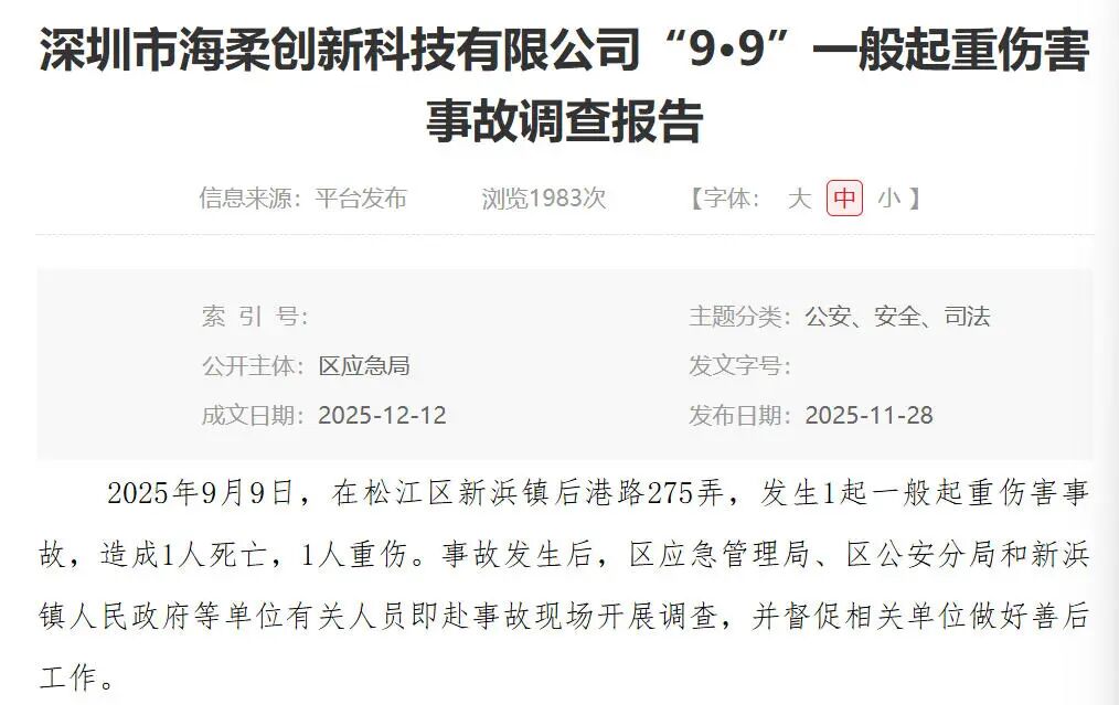 根据上海市松江区人民政府2025年11月28日发布的《深圳市海柔创新科技有限公司“9·9”一般起重伤害事故调查报告》(下称《调查报告》),2025年9月9日,在松江区新浜镇后港路275弄,发生1起一般起重伤害事故,造成1人死亡(邱某某,男,24岁,湖南衡阳县人,海柔公司机械设计工,事发时处于实习期,在施工现场学习),1人重伤(邵某,男,36岁,辽宁朝阳县人,海柔公司技术工程师,负责施工现场管理)。经调查认定,该事故是一起因作业人员违反吊装作业操作规程、涉事单位作业现场安全管理不到位、涉事起重机吊钩存在缺陷不符合安全要求而导致的一般生产安全责任事故,事故造成直接经济损失约200万元。
