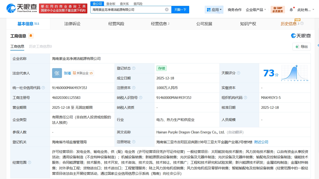 天眼查App显示,近日,海南紫金龙净清洁能源有限公司成立,法定代表人为张瑾,注册资本1000万人民币,经营范围含发电业务、输电业务、供(配)电业务,太阳能发电技术服务,风力发电技术服务,以自有资金从事投资活动,通用设备制造,机械设备销售,新能源原动设备销售,光伏设备及元器件制造等,由龙净环保(600388)全资持股。
