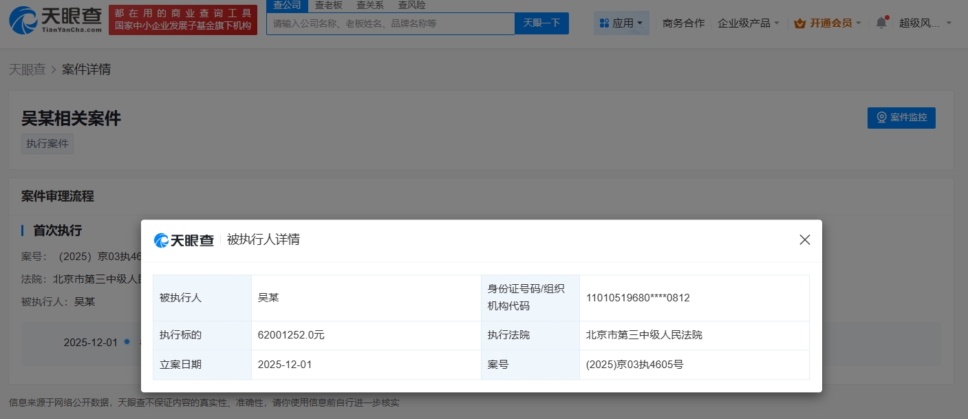 天眼查天眼风险信息显示,近日,吴秀波新增一则被执行人信息,执行标的6200万余元,执行法院为北京市第三中级人民法院。