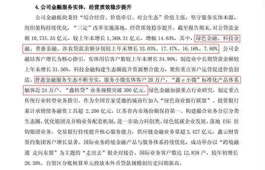 一是探索差异化路径。为了降低对传统房地产和平台贷的依赖,南京银行紧跟区域经济脉动,不断探索差异化发展路径,在科技金融、绿色金融、普惠金融、养老金融和数字金融等领域形成了品牌特色。