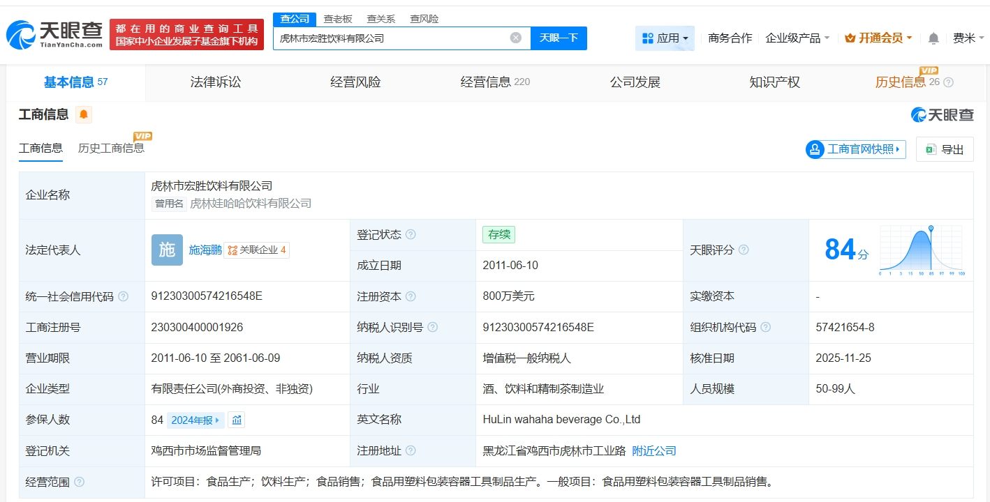 天眼查工商信息显示,近日,虎林市宏胜饮料有限公司发生工商变更,祝丽丹卸任法定代表人、总经理,由施海鹏接任。