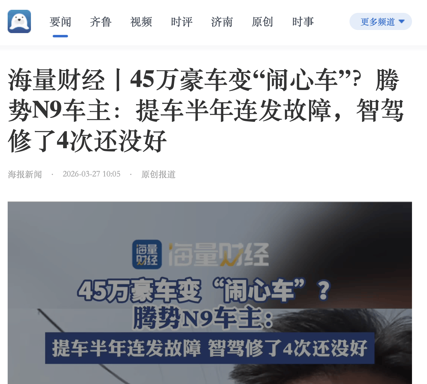 45万的腾势N9怎么了?提车半年故障不断,智驾修了4次还没好快讯
