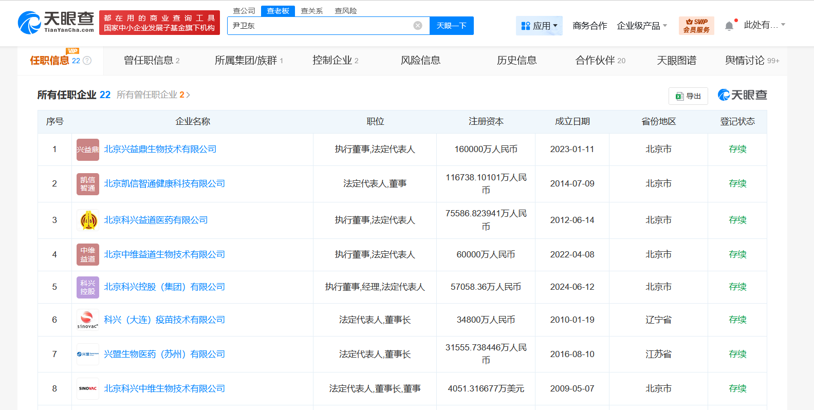 商业履历信息显示,科兴生物董事长尹卫东名下关联20余家企业,其中18家为存续状态,包括北京科兴益道医药有限公司、北京兴益鼎生物技术有限公司、科兴中维(海南)生物技术有限公司等,尹卫东在上述公司担任执行董事、法定代表人等。