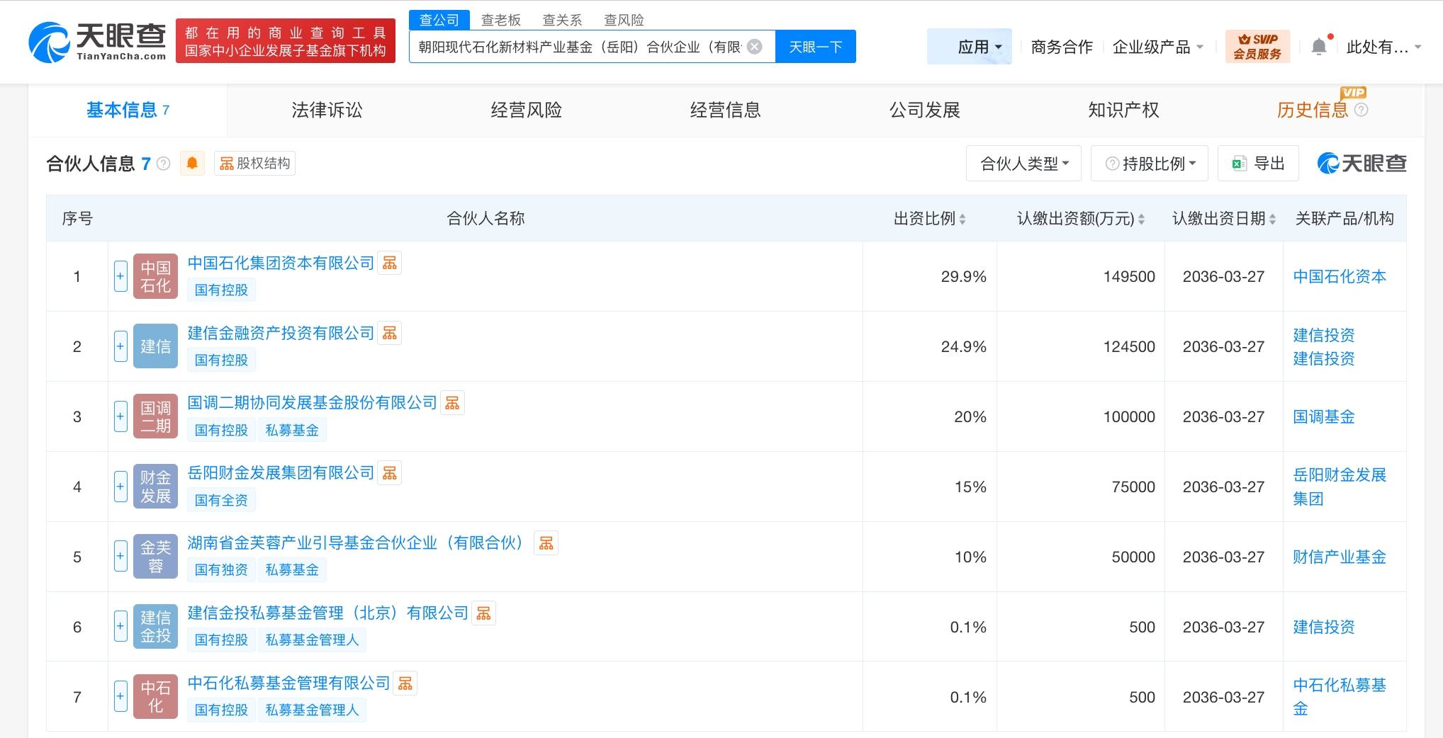 天眼查工商信息显示,近日,朝阳现代石化新材料产业基金(岳阳)合伙企业(有限合伙)成立,执行事务合伙人为中石化私募基金管理有限公司、建信金投私募基金管理(北京)有限公司,出资额50亿人民币,经营范围包括创业投资,以私募基金从事股权投资、投资管理、资产管理等活动,企业管理咨询。合伙人信息显示,该基金由中国石化集团资本有限公司、建信金融资产投资有限公司、国调二期协同发展基金股份有限公司、岳阳财金发展集团有限公司等共同出资。