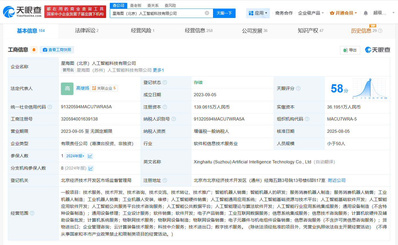 星海图(北京)人工智能科技有限公司成立于2023年9月,法定代表人为高继扬,经营范围包括智能机器人的研发、人工智能通用应用系统等。股东信息显示,该公司现由高继扬、上海米哈游阿尔戈科技有限公司、联想中小企业发展创业投资基金(天津)合伙企业(有限合伙)及上述新增股东等共同持股。公开信息显示,星海图是一家专注于具身智能基础模型及具身智能机器人研发的人工智能公司。