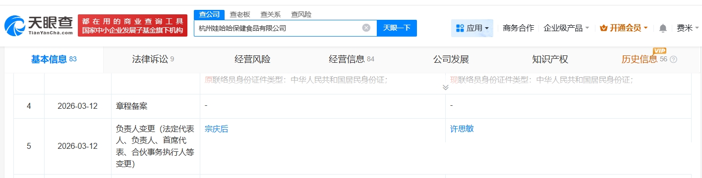 天眼查工商信息显示,近日,杭州娃哈哈保健食品有限公司发生工商变更,宗庆后卸任法定代表人、董事长,潘家杰卸任总经理,许思敏任法定代表人、董事、经理。
