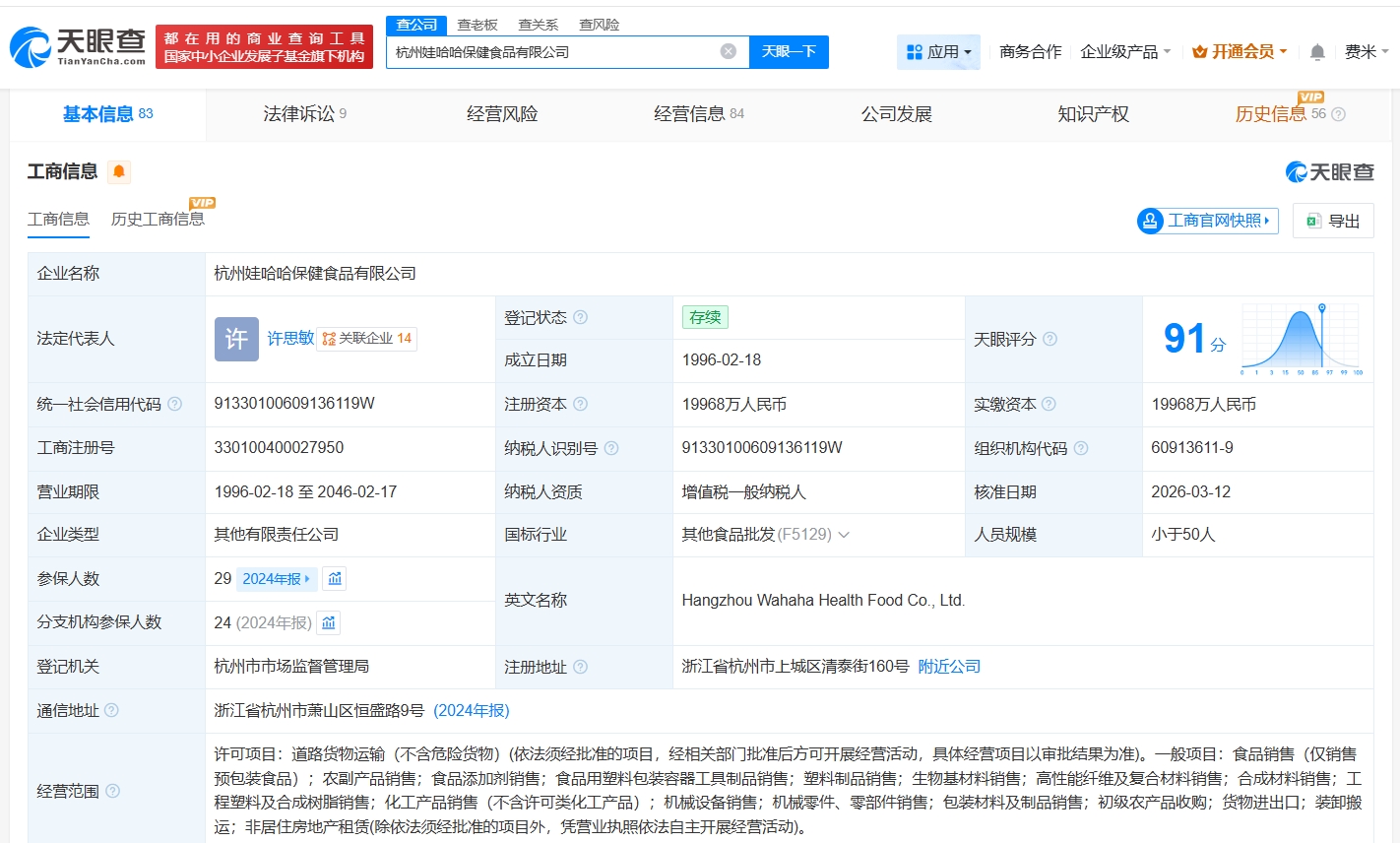 杭州娃哈哈保健食品有限公司成立于1996年2月,注册资本约2亿人民币,经营范围包括食品销售、农副产品销售、食品添加剂销售等。股东信息显示,该公司由杭州宏振投资有限公司、杭州娃哈哈集团有限公司、浙江娃哈哈实业股份有限公司共同持股。
