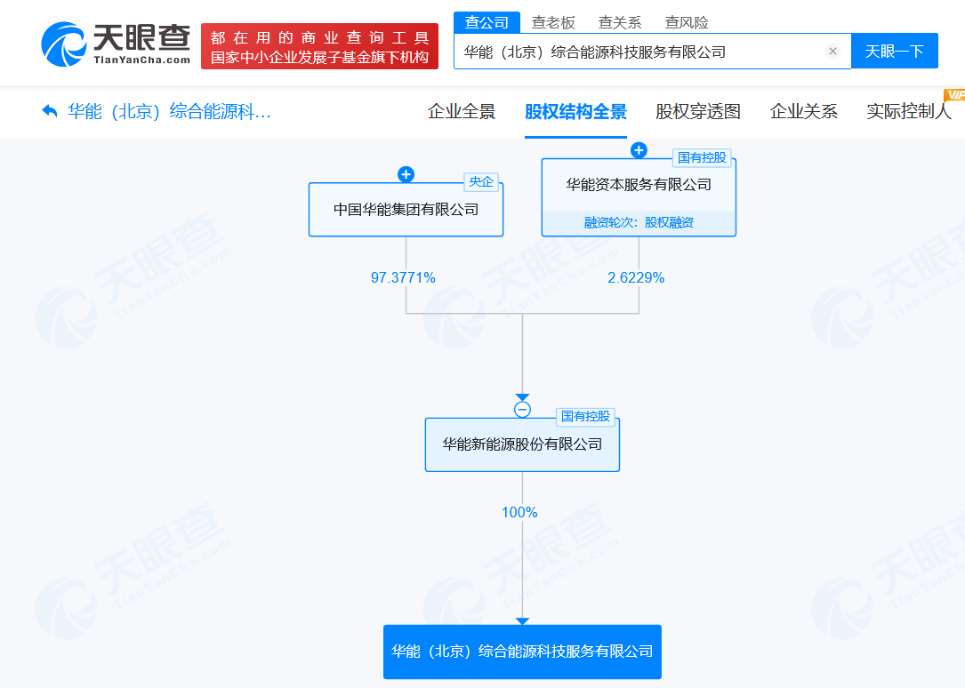天眼查App显示,近日,华能(北京)综合能源科技服务有限公司成立,法定代表人为熊汀,注册资本2亿人民币,经营范围含合同能源管理,碳减排、碳转化、碳捕捉、碳封存技术研发,数据处理和存储支持服务,储能技术服务,资源循环利用服务技术咨询,电动汽车充电基础设施运营,电子、机械设备维护,发电业务、输电业务、供(配)电业务等。股东信息显示,该公司由中国华能集团旗下华能新能源股份有限公司全资持股。