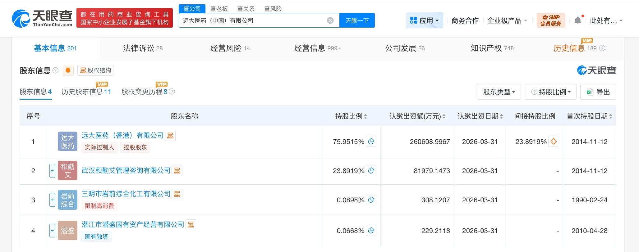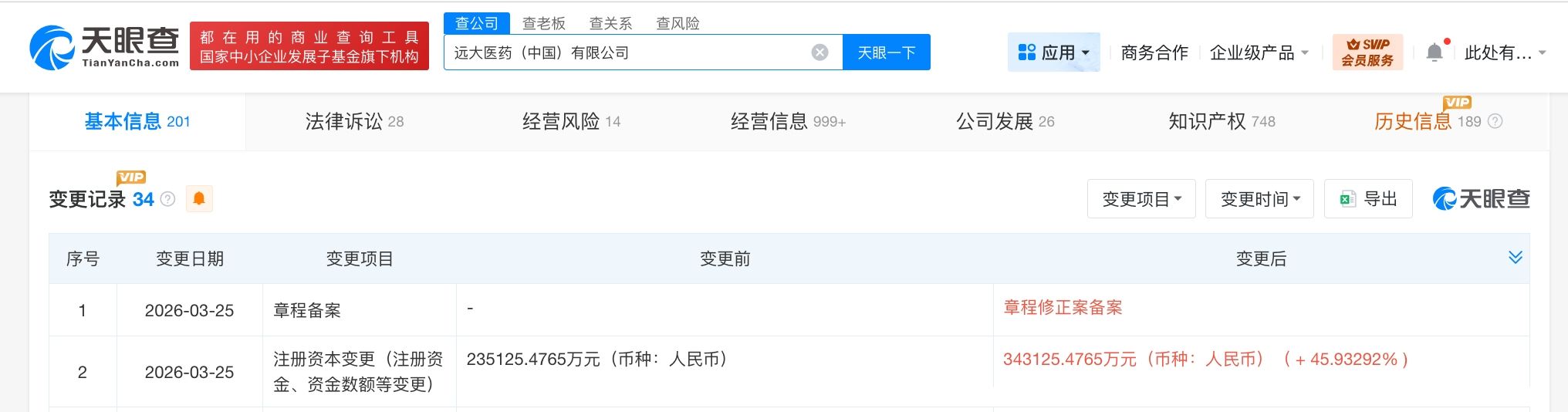 天眼查工商信息显示,近日,远大医药(中国)有限公司发生工商变更,注册资本由约23.5亿人民币增至约34.3亿人民币,增幅约46%。