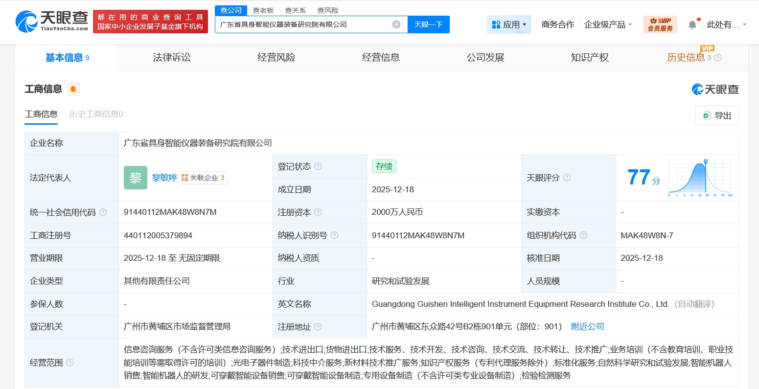 近日,广东省具身智能仪器装备研究院有限公司成立,法定代表人为黎敏婷,注册资本2000万人民币,经营范围含信息咨询服务、技术进出口、货物进出口、光电子器件制造、科技中介服务、新材料技术推广服务、知识产权服务、自然科学研究和试验发展、智能机器人销售、智能机器人的研发、可穿戴智能设备销售等,由广东省科学院认证有限公司、广州众纳科技有限公司共同持股。