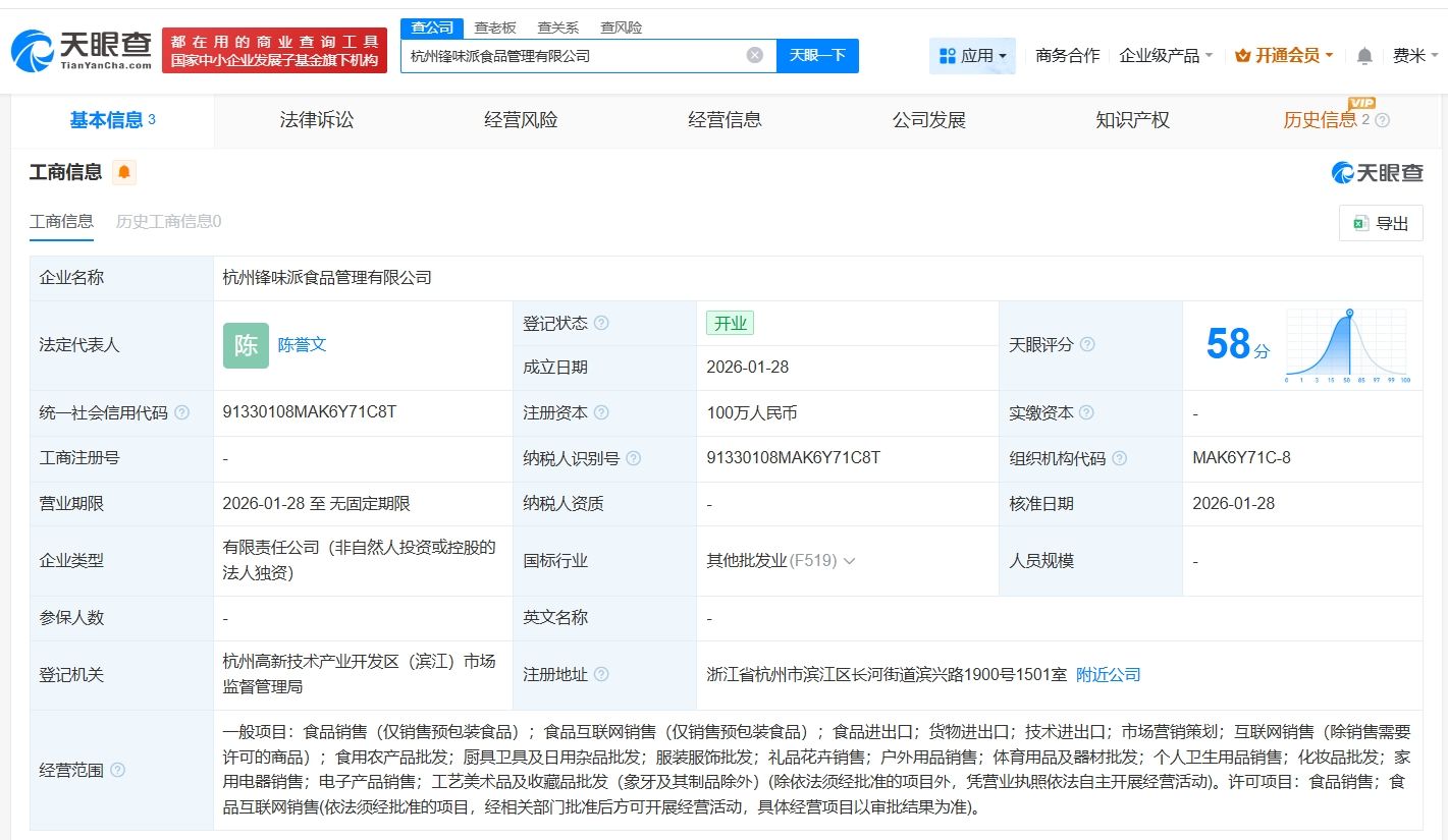 天眼查App显示,近日,杭州锋味派食品管理有限公司成立,法定代表人为陈誉文,注册资本100万人民币,经营范围包括食品互联网销售、食品进出口、货物进出口等,由谢霆锋创立的食品品牌关联公司杭州锋味派食品有限公司全资持股。