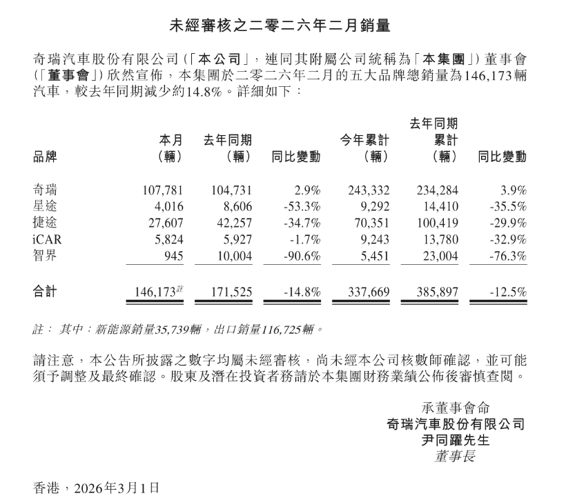 根据奇瑞汽车股份有限公司发布的未经审核之销量数据,2026年2月,iCAR品牌单月销量为5824台,同比微降1.7%。