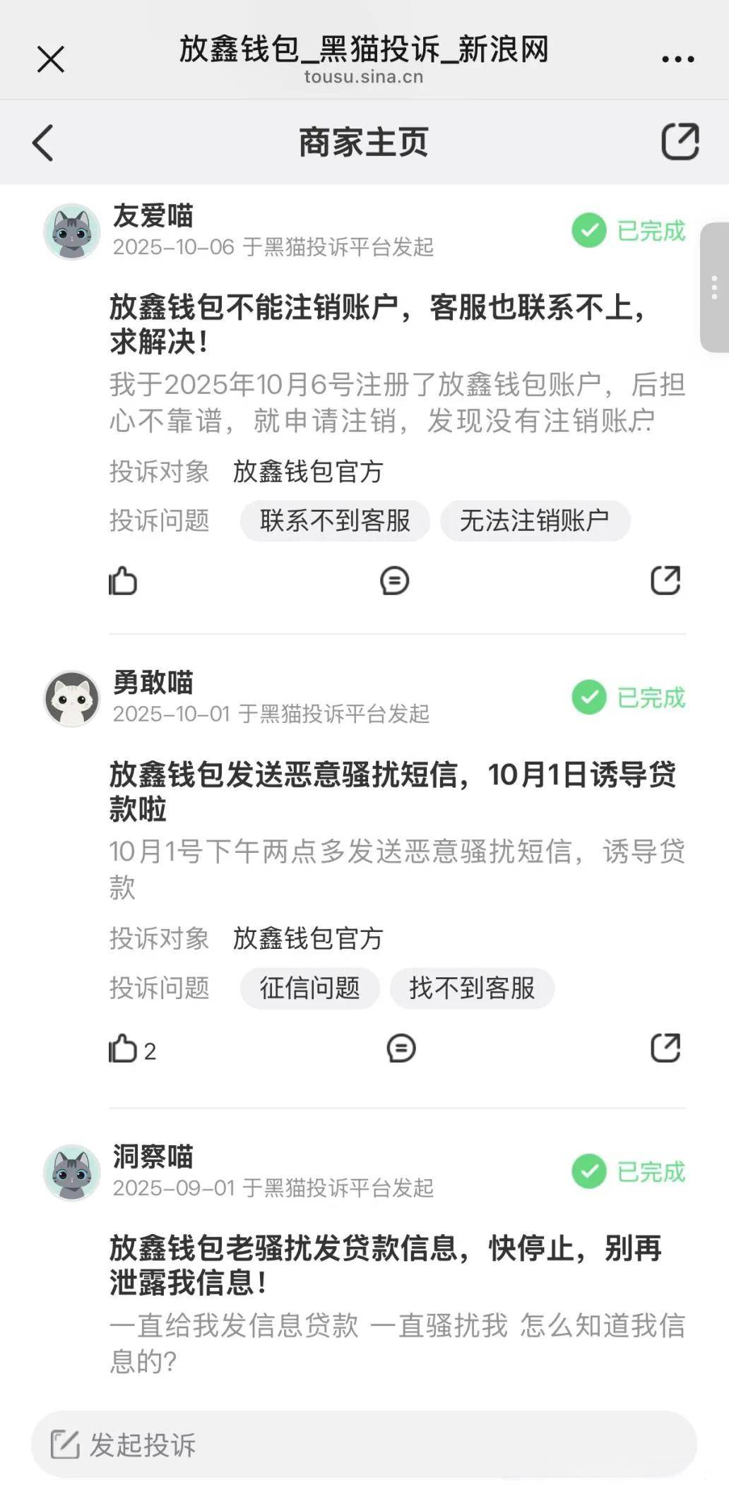 在黑猫投诉平台,有关放鑫钱包的争议也多围绕“盗用身份证信息”、“电话短信轰炸”、“无本人授权下申请贷款并授信”等情形,投诉信息中也提及“无法注销账户”、“无法联系客服”等情况,暴露出第三方运营中不专业、不稳定的问题。