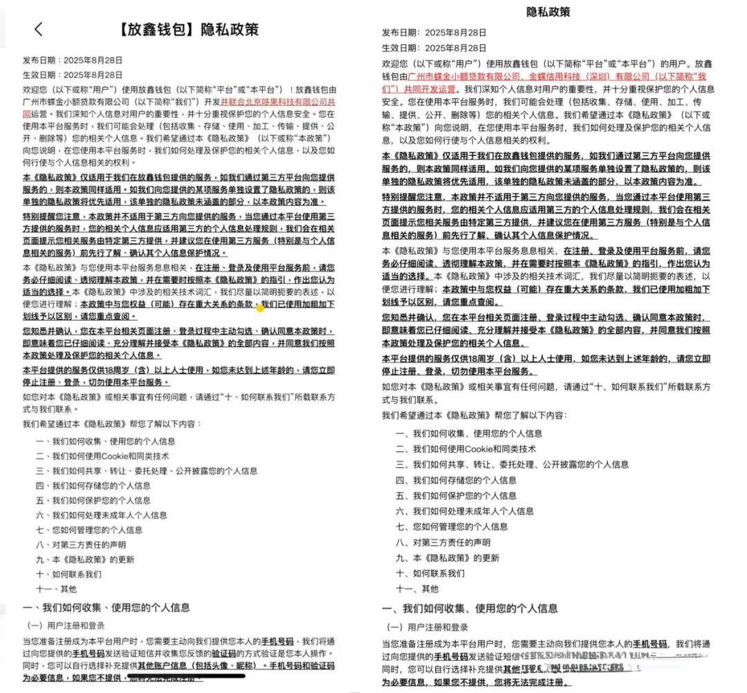 其借款App“放鑫钱包”更是一颗“定时炸弹”。这款号称要为中小企业提供便捷信贷“超市”的App,从诞生之初就饱受质疑。涉嫌“套取信息”和牌照疑似“出租”的行为,让用户对其安全性与合规性产生了极大的怀疑。放鑫钱包App产品隐私政策显示,放鑫钱包由蝶金小贷开发,并联合一家名为北京哆果科技有限公司共同运营。天眼查数据显示,“哆果科技”成立于2022年,是一家“科技推广服务”公司,2022年-2024年参保人数为0。据报道,哆果科技通过其开放运营的“哆乐帮”App为放鑫钱包提供渠道服务。值得注意的是,被曝光后,放鑫钱包已对这一信息作出修改,将联合运营方“哆果科技”改为“金蝶信科”。