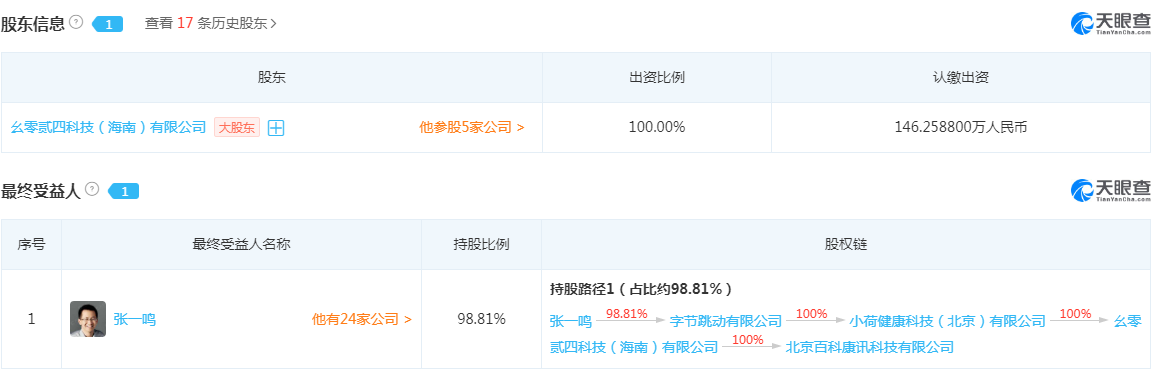 据天眼查APP检索显示,字节跳动的控股的公司幺零贰四科技已经收购了百科名医所属的百科康讯。