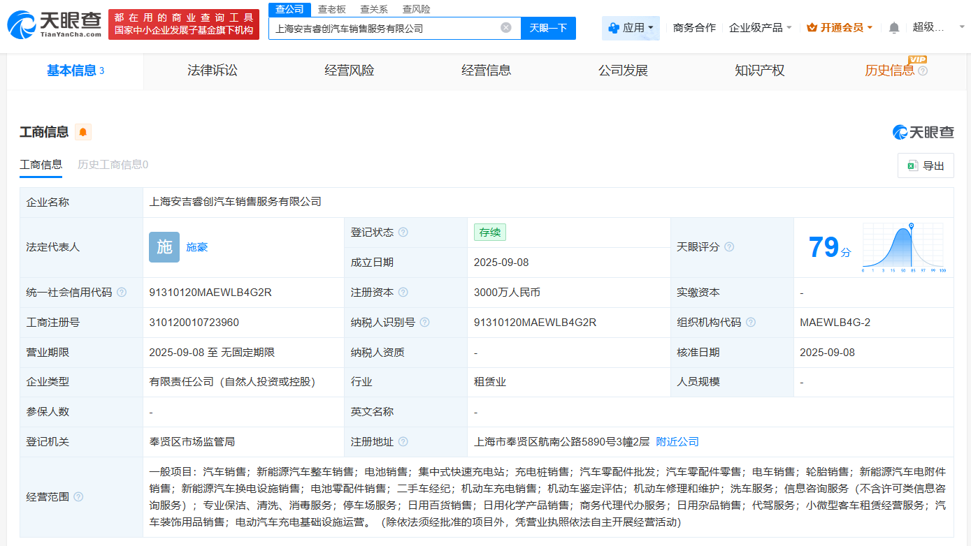 天眼查工商信息显示,近日,上海安吉睿创汽车销售服务有限公司成立,法定代表人为施豪,注册资本3000万人民币,经营范围包括汽车销售、新能源汽车整车销售、电池销售、集中式快速充电站等。