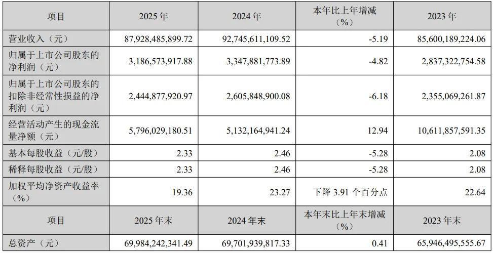 财报显示,2025年,海信家电实现营收879.28亿元,同比减少5.19%;归母净利润31.87亿元,同比减少4.82%。