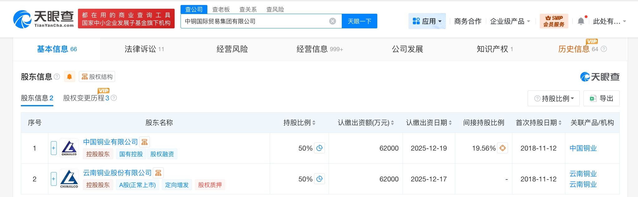 该公司成立于2018年11月,法定代表人为陈超,经营范围包括货物进出口、金属矿石销售、有色金属合金销售等,由中国铜业有限公司、云南铜业(000878)共同持股。