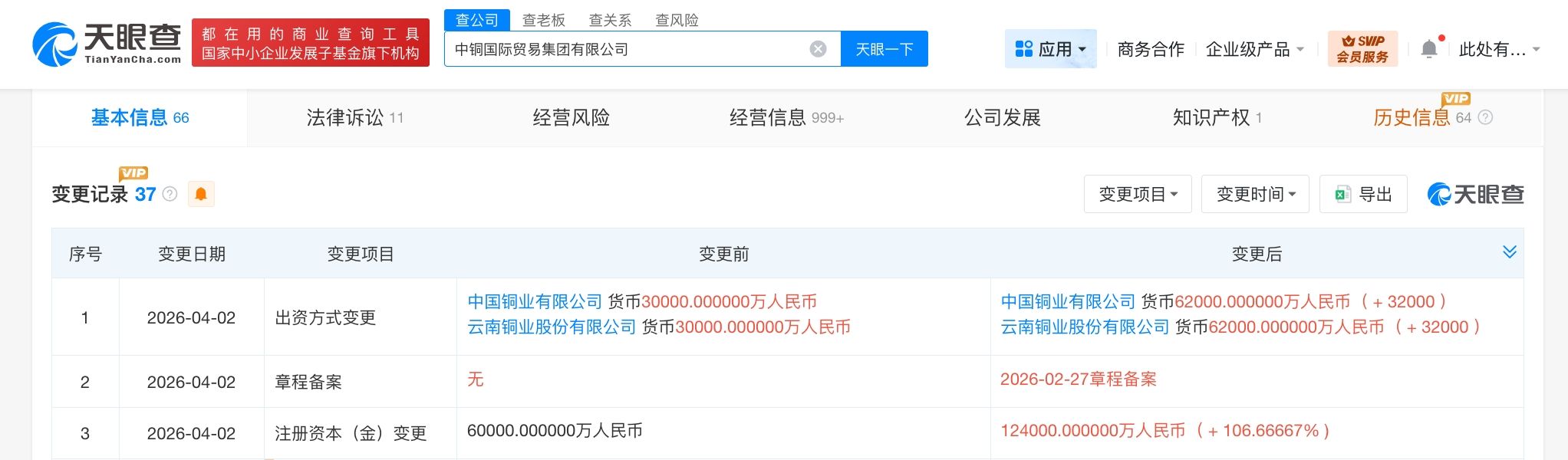天眼查工商信息显示,近日,中铜国际贸易集团有限公司发生工商变更,注册资本由6亿人民币增至12.4亿人民币,增幅约107%。