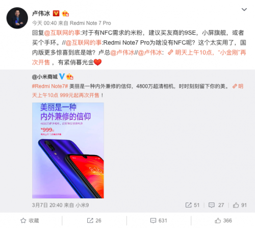 卢伟冰:红米Note 7 Pro不支持NFC,建议买友商小米9 SE快报