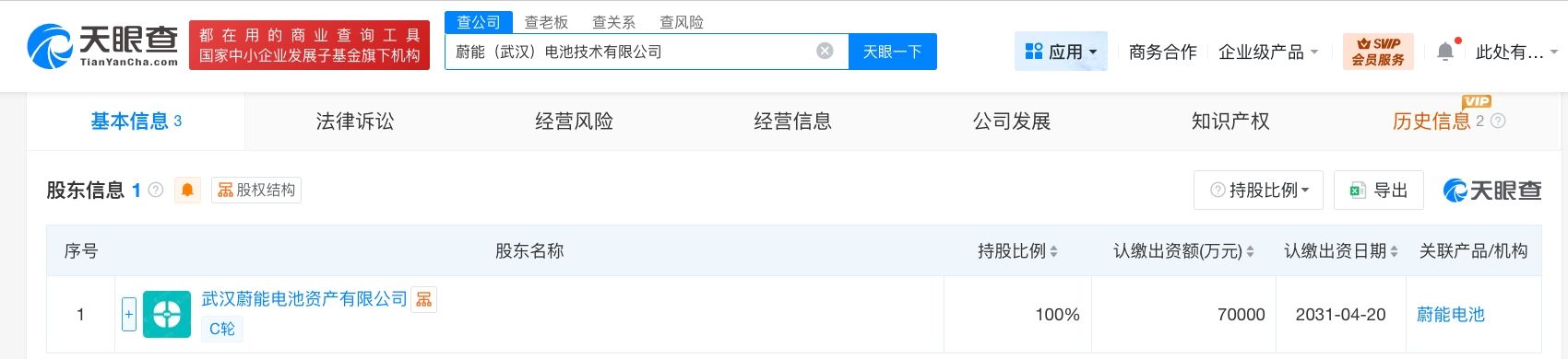 天眼查工商信息显示,近日,蔚能(武汉)电池技术有限公司成立,法定代表人为张建新,注册资本7亿人民币,经营范围包括蓄电池租赁、电动汽车充电基础设施运营、电池制造等。股东信息显示,该公司由武汉蔚能电池资产有限公司全资持股。
