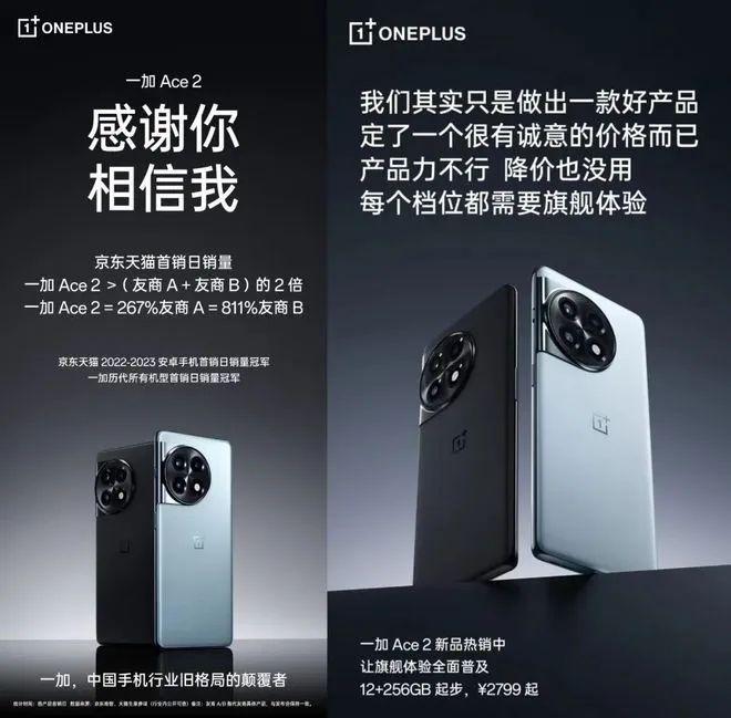 譬如,今年2月份,在一加Ace2首销日,一加曾发布海报,宣称京东天猫首日销量,大于友商A+友商B的两倍,并且在战报文案里把自己定位为“中国手机行业旧秩序的颠覆者”。此处笔者疑惑不已,“一加成为旧秩序的颠覆者”是有第三方数据支撑还是在用户期间做了专业调查,如此盲目为自己下结论,难道不是迷惑消费者行为?这是将消费者智商按在地上摩擦的表现。