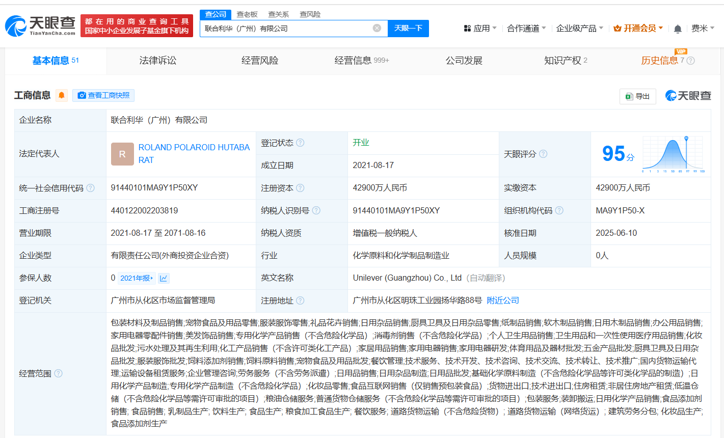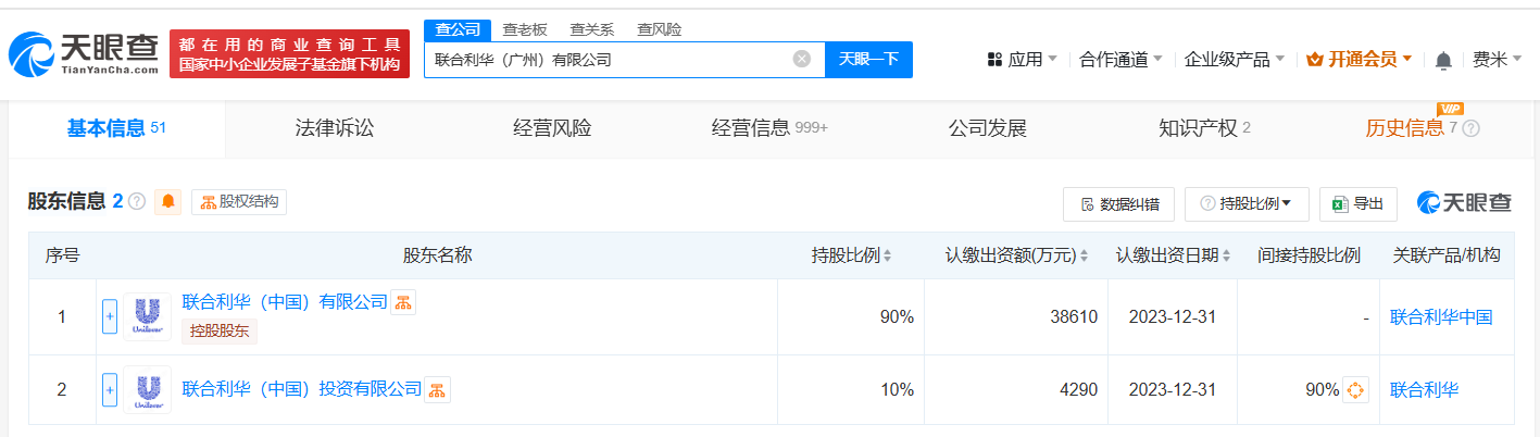 联合利华(广州)有限公司成立于2021年8月,注册资本4.29亿人民币,经营范围包括包装材料及制品销售、宠物食品及用品零售、服装服饰零售等,由联合利华(中国)有限公司、联合利华(中国)投资有限公司共同持股。