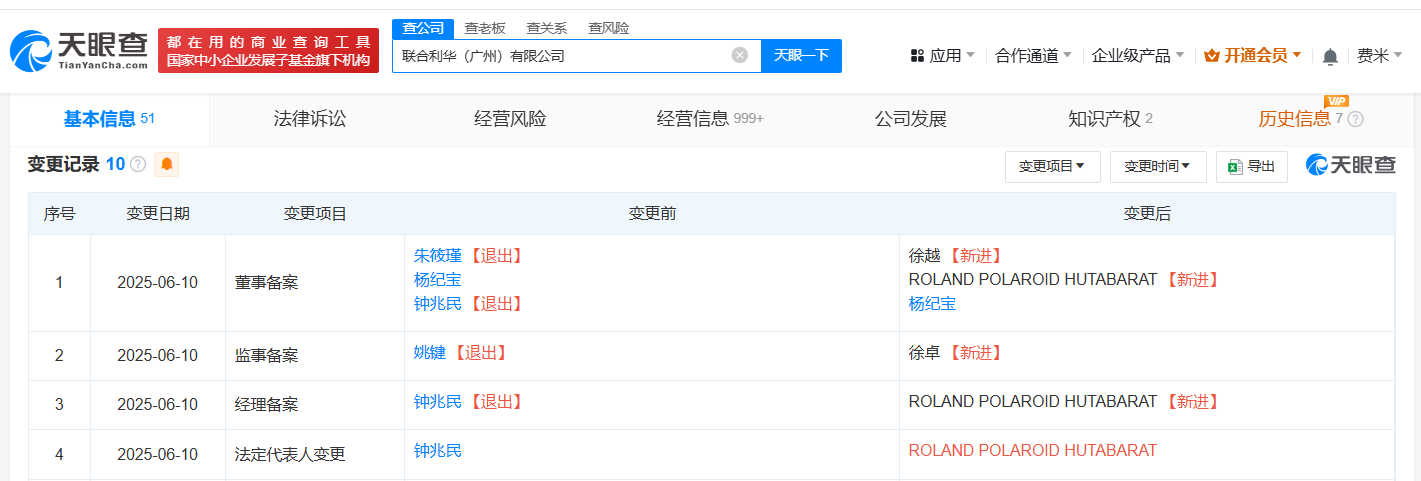 近日,联合利华(广州)有限公司发生工商变更,钟兆民卸任法定代表人、董事长、总经理,ROLAND POLAROID HUTABARAT接任法定代表人、董事长,并担任经理职位,同时多位高管发生变更。