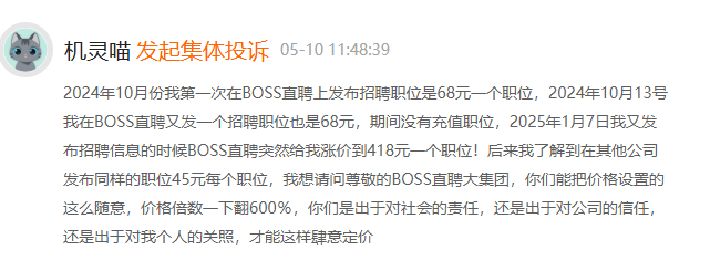 首先是VIP的涨价,有网友称,去年9月还是288元,结果一个月后涨价80块。另外黑猫投诉上,有人投诉BOSS直聘发布一个岗位从68元涨价到418元。
