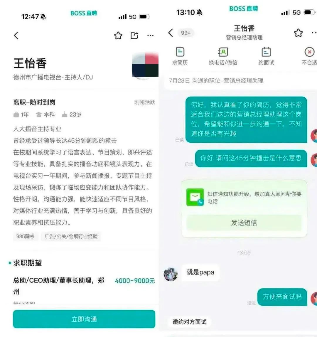 事件起因是一位名叫“王怡香”的女生在BOSS上求职,本科学历,求职董事长助理岗位,曾系“山东省德州市广播电视台主持人”,处于已离职状态。
