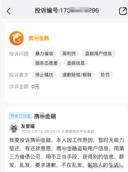 逾期次日就遭遇电话轰炸,欠款五百余元竟被爆通讯录、言语恐吓,明明有还款意愿却被平台委托的第三方催收机构盗取信息、群发骚扰……2026 年 3 月以来,黑猫投诉平台接连出现针对携程金融的投诉,涉诉金额从五百余元到五万余元不等,暴力催收、涉嫌高利贷、盗取用户信息等问题成为投诉核心,即便部分投诉显示商家已回复,但借款人遭遇的违规催收困扰并未消失。从短期逾期的极致施压,到第三方催收的无底线操作,携程金融的催收乱象再次撕开网贷行业的催收漏洞,平台与第三方催收的权责边界、催收行为的合规底线,成为亟待厘清的行业难题。