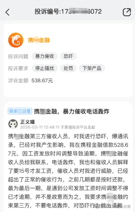 3 月 11 日,用户 “正义喵” 的投诉更凸显出携程金融催收的极端性,该用户仅在携程金融借款 528.67 元,因公司工资发放时间调整导致最后一期欠款逾期,并非故意拖欠,且已向催收人员明确说明 15 号发薪后即可还款,此前还款记录均保持良好。即便如此,携程金融委托的第三方催收人员仍对其实施电话轰炸,还进行言语恐吓、爆通讯录,一系列行为已超出正常催收范畴,用户要求携程金融约束第三方催收机构、停止骚扰,并对恐吓行为作出正式道歉,该投诉同样显示商家已回复,但未对用户的合理诉求给出明确解决方案。