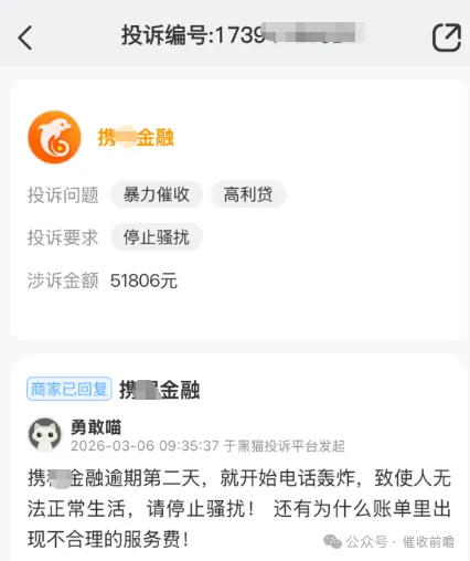 3 月 6 日,用户 “勇敢喵” 在黑猫投诉平台发起对携程金融的投诉,涉诉金额高达 51806 元,该用户表示在携程金融的欠款仅逾期第二天,就遭遇了平台的电话轰炸,正常生活受到严重干扰,其不仅要求平台停止骚扰,还对账单中出现的不合理服务费提出质疑,直指平台存在高利贷嫌疑,该投诉目前显示商家已回复,但电话轰炸的违规催收行为并未提及整改结果。